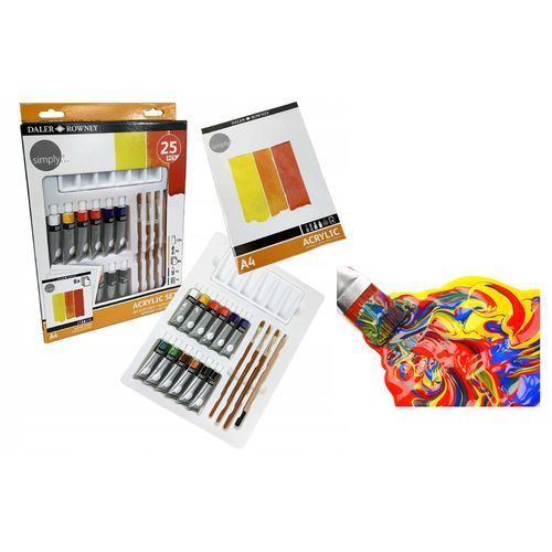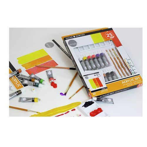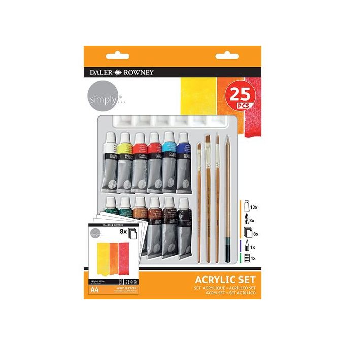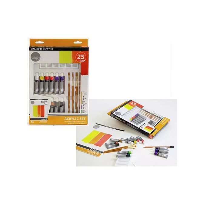Ensemble d’art Acrylique,25 pièces:12 tubes,3 Brosses,8 Feuilles,Crayon,PaletteMarque : Daler RowneyL’ensemble contient: – 12 Couleurs Tubes 12ml Peinture acryliques, – 3 x brosses Simply, – 8 feuilles de papier acrylique A4- 1 x crayon Simply HB – 1 x palette de mélange.
