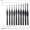 Détail pinceaux : 10 différents pinceaux en taille 5/0, 3/0, 2/0, 0, 1, 2, 3, 4, 6, 8, emballées dans un sac en plastique uni et maintenu par élastique sur une pièce de la carte