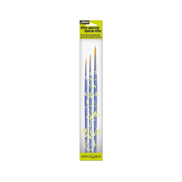 Polyamide doré n° 000, 2, 6 Plusieurs qualités de poils et formes de pinceaux manches longs et manches courts ont été sélectionnés dans cette sélection de pochettes. On retrouve du polyamide doré, du polyamide brun et des soies beau blanc avec des formes rondes et plates.