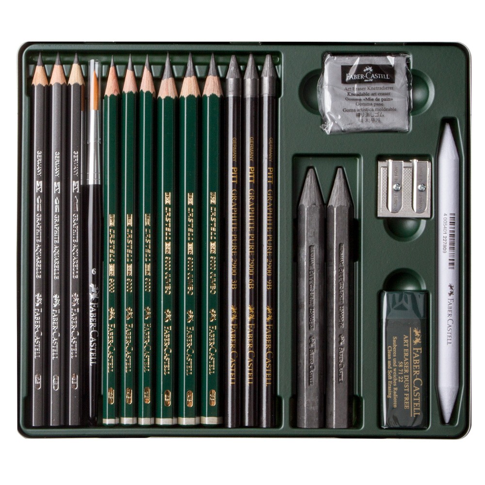 - Un assortiment exclusif composé d’un Castell 9000, d’un Castell 9000 Jumbo et de crayons graphite aquarelle dans les niveaux de dureté 2B, 4B et 8B, des crayons Pitt Graphite Pure dans les degrés de dureté 3B, 6B et 9B, des craies Pitt Graphite dans les degrés de dureté 6B, 9B et des accessoires
