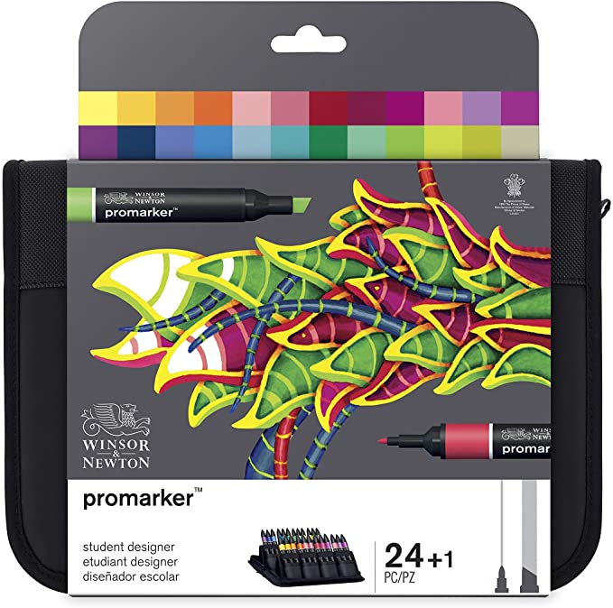 1 trousse de 24 marqueurs (Student Designer). Les marqueurs ProMarker de Winsor & Newton sont idéaux pour découvrir la mise en couleur. Leurs encres, non toxiques, à base d’alcool et de colorants, permettent une application uniforme et impeccable à chaque utilisation.